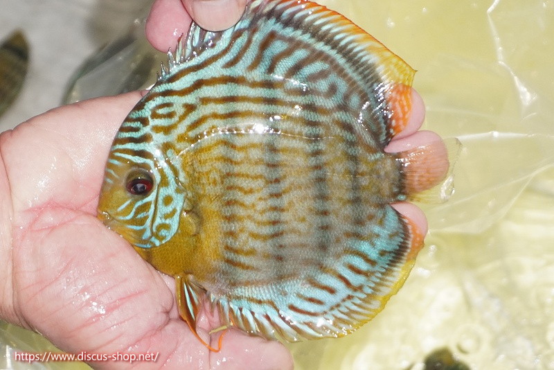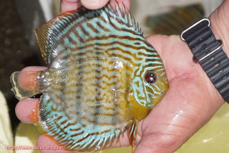 グリーンディスカスの中でも最もバリエーションが豊富でラージスポットタイプ、スポットラインタイプをはじめ、ロイヤルラインタイプなどの極上個体。またベースカラーの黄色、ホリゾンタルラインの青み、スポットの赤と最もカラフルな種となります。仕上がれば改良品種顔負けのど派手なパターンを持つ魅力的な産地の個体となります。