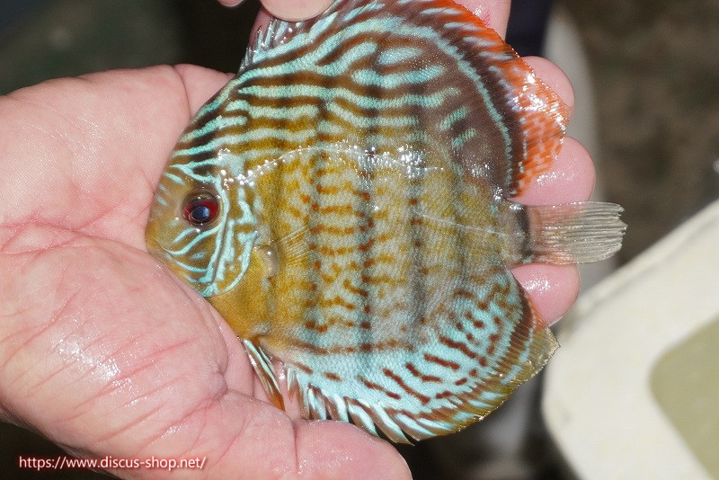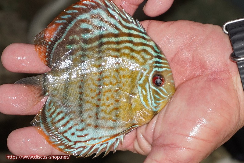 グリーンディスカスの中でも最もバリエーションが豊富でラージスポットタイプ、スポットラインタイプをはじめ、ロイヤルラインタイプなどの極上個体。またベースカラーの黄色、ホリゾンタルラインの青み、スポットの赤と最もカラフルな種となります。仕上がれば改良品種顔負けのど派手なパターンを持つ魅力的な産地の個体となります。