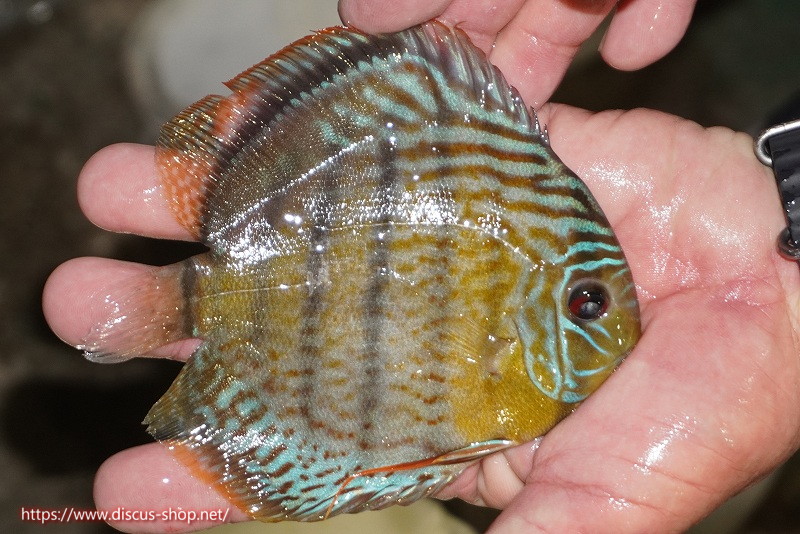 グリーンディスカスの中でも最もバリエーションが豊富でラージスポットタイプ、スポットラインタイプをはじめ、ロイヤルラインタイプなどの極上個体。またベースカラーの黄色、ホリゾンタルラインの青み、スポットの赤と最もカラフルな種となります。仕上がれば改良品種顔負けのど派手なパターンを持つ魅力的な産地の個体となります。