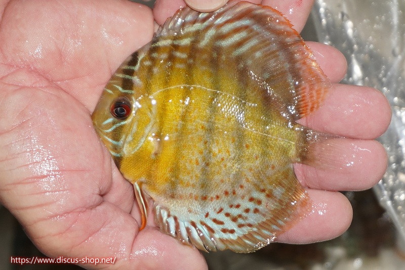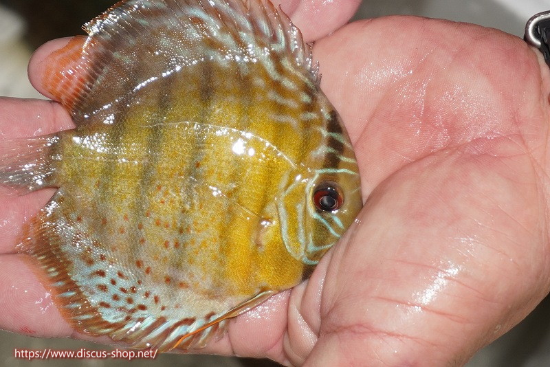 グリーンディスカスの中でも最もバリエーションが豊富でラージスポットタイプ、スポットラインタイプをはじめ、ロイヤルラインタイプなどの極上個体。またベースカラーの黄色、ホリゾンタルラインの青み、スポットの赤と最もカラフルな種となります。仕上がれば改良品種顔負けのど派手なパターンを持つ魅力的な産地の個体となります。