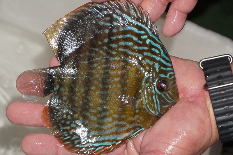 美しいラウンドフォルム、17センチを優に超える体躯でブルーディスカスの常識を覆した産地。下流域にはラインパターン、ソリッドが混生し、上流域には目を見張る様な青を発色するヘッケルが生息する。