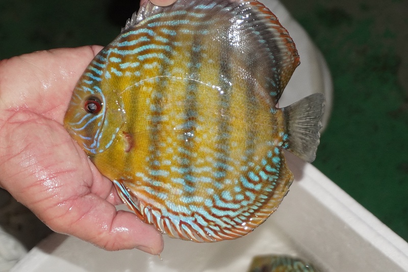 美しいラウンドフォルム、17センチを優に超える体躯でブルーディスカスの常識を覆した産地。下流域にはラインパターン、ソリッドが混生し、上流域には目を見張る様な青を発色するヘッケルが生息する。