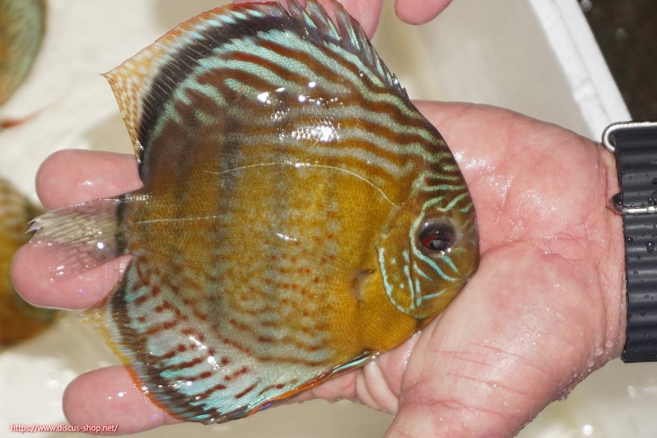 グリーンディスカスの中でも最もバリエーションが豊富でラージスポットタイプ、スポットラインタイプをはじめ、ロイヤルラインタイプなどの極上個体。またベースカラーの黄色、ホリゾンタルラインの青み、スポットの赤と最もカラフルな種となります。仕上がれば改良品種顔負けのど派手なパターンを持つ魅力的な産地の個体となります。