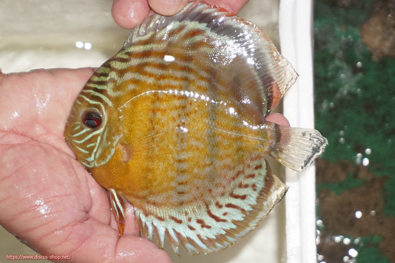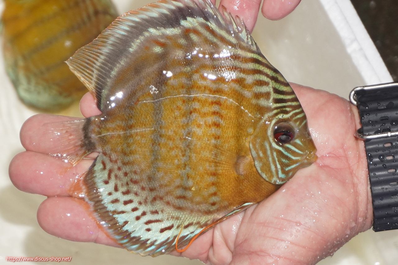 グリーンディスカスの中でも最もバリエーションが豊富でラージスポットタイプ、スポットラインタイプをはじめ、ロイヤルラインタイプなどの極上個体。またベースカラーの黄色、ホリゾンタルラインの青み、スポットの赤と最もカラフルな種となります。仕上がれば改良品種顔負けのど派手なパターンを持つ魅力的な産地の個体となります。