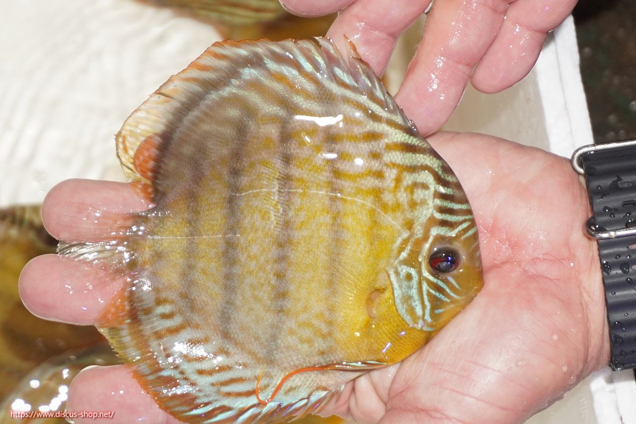 グリーンディスカスの中でも最もバリエーションが豊富でラージスポットタイプ、スポットラインタイプをはじめ、ロイヤルラインタイプなどの極上個体。またベースカラーの黄色、ホリゾンタルラインの青み、スポットの赤と最もカラフルな種となります。仕上がれば改良品種顔負けのど派手なパターンを持つ魅力的な産地の個体となります。