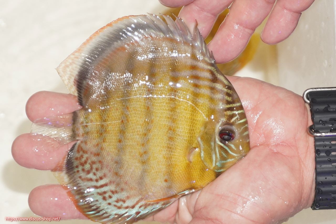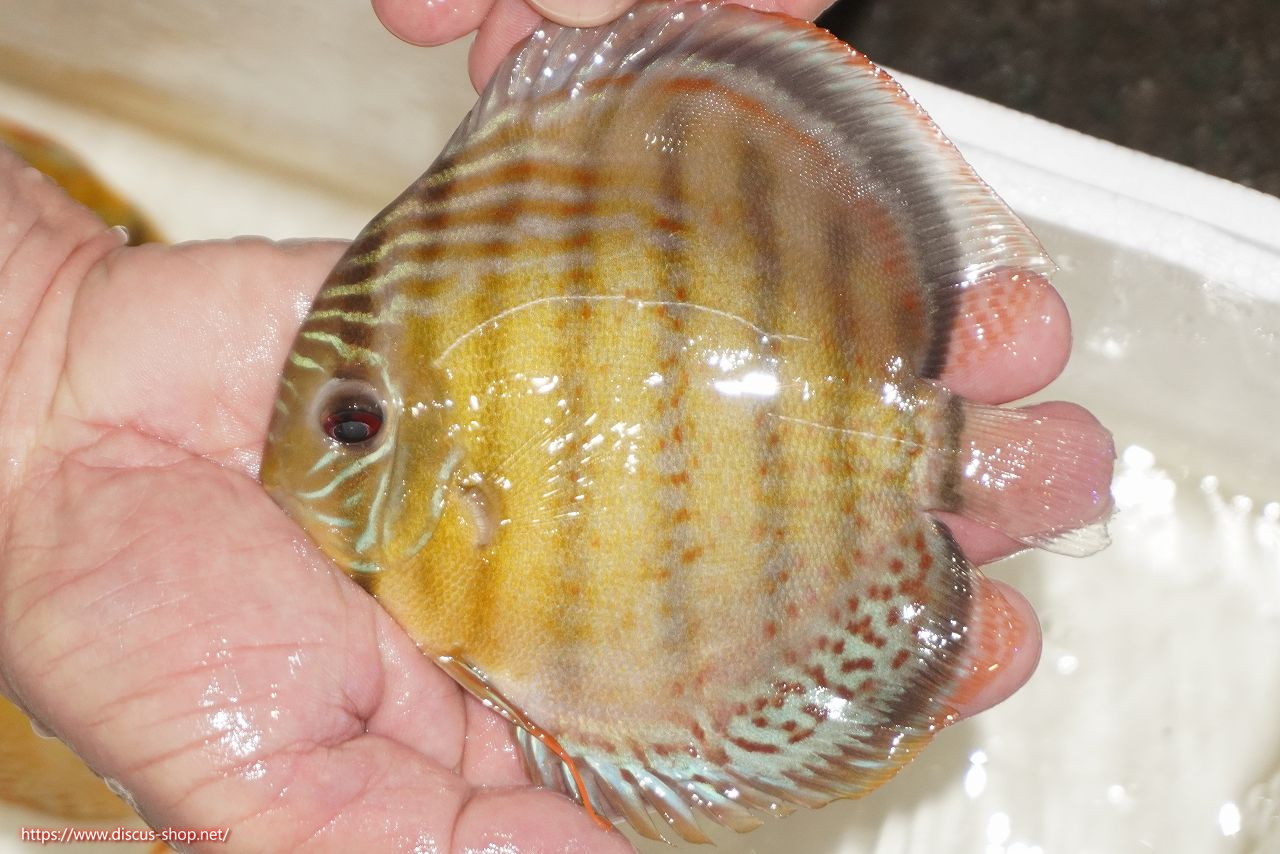 グリーンディスカスの中でも最もバリエーションが豊富でラージスポットタイプ、スポットラインタイプをはじめ、ロイヤルラインタイプなどの極上個体。またベースカラーの黄色、ホリゾンタルラインの青み、スポットの赤と最もカラフルな種となります。仕上がれば改良品種顔負けのど派手なパターンを持つ魅力的な産地の個体となります。