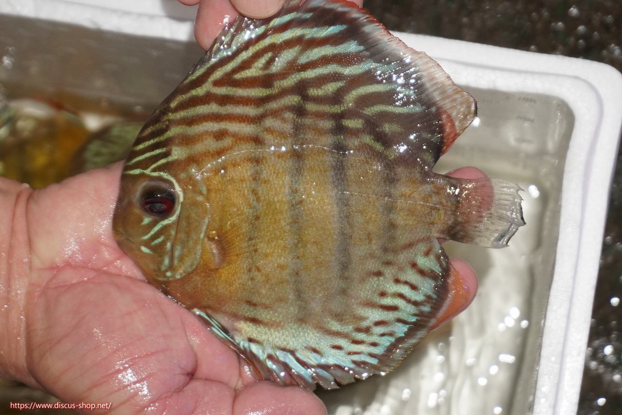 グリーンディスカスの中でも最もバリエーションが豊富でラージスポットタイプ、スポットラインタイプをはじめ、ロイヤルラインタイプなどの極上個体。またベースカラーの黄色、ホリゾンタルラインの青み、スポットの赤と最もカラフルな種となります。仕上がれば改良品種顔負けのど派手なパターンを持つ魅力的な産地の個体となります。