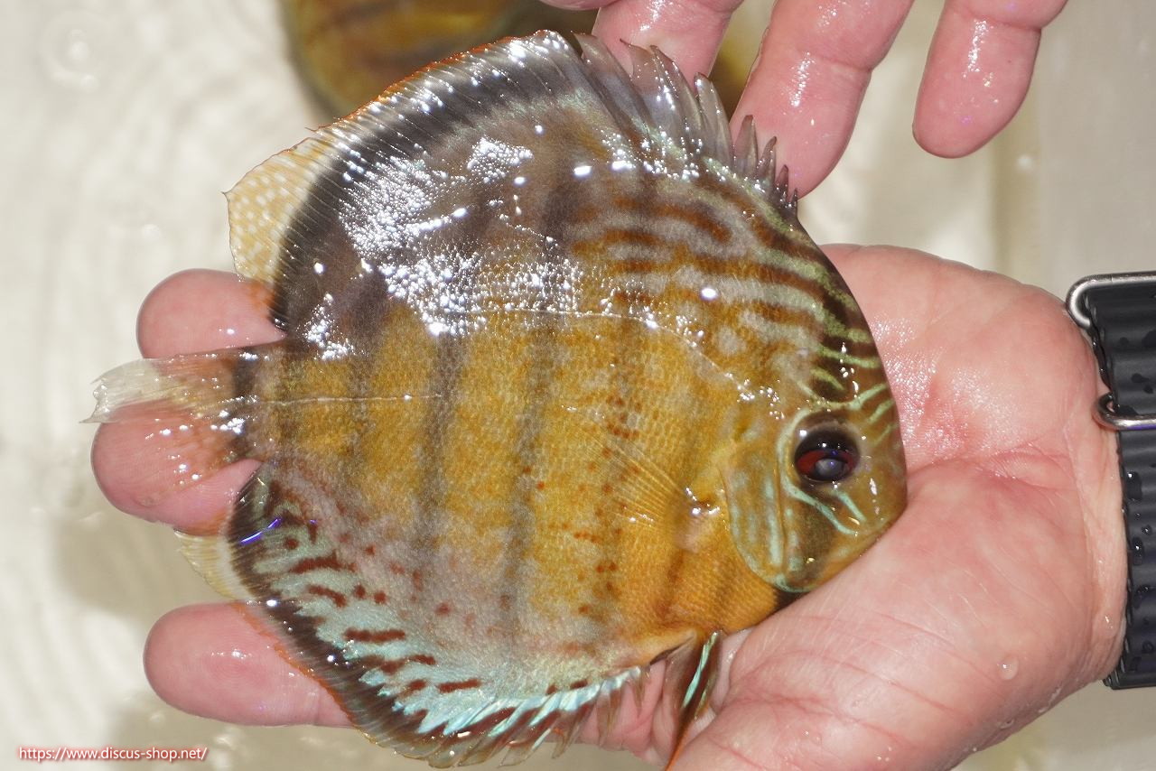 グリーンディスカスの中でも最もバリエーションが豊富でラージスポットタイプ、スポットラインタイプをはじめ、ロイヤルラインタイプなどの極上個体。またベースカラーの黄色、ホリゾンタルラインの青み、スポットの赤と最もカラフルな種となります。仕上がれば改良品種顔負けのど派手なパターンを持つ魅力的な産地の個体となります。