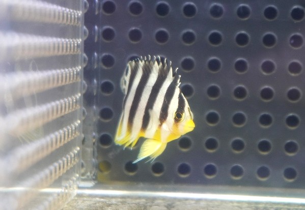【決算セール クーポンご利用で更に10%OFF対象商品】 【海水魚・ヤッコ】【通販】人工飼料OK♪【国産ブリード】シマヤッコ(Sサイズ/太バンド)(個体販売)(±3cm) No.2(生体)(海水魚)