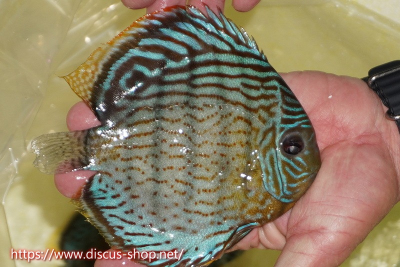 グリーンディスカスの中でも最もバリエーションが豊富でラージスポットタイプ、スポットラインタイプをはじめ、ロイヤルラインタイプなどの極上個体。またベースカラーの黄色、ホリゾンタルラインの青み、スポットの赤と最もカラフルな種となります。仕上がれば改良品種顔負けのど派手なパターンを持つ魅力的な産地の個体となります。