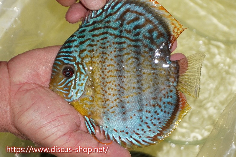 グリーンディスカスの中でも最もバリエーションが豊富でラージスポットタイプ、スポットラインタイプをはじめ、ロイヤルラインタイプなどの極上個体。またベースカラーの黄色、ホリゾンタルラインの青み、スポットの赤と最もカラフルな種となります。仕上がれば改良品種顔負けのど派手なパターンを持つ魅力的な産地の個体となります。