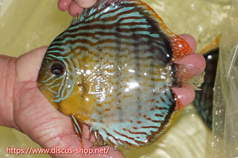 グリーンディスカスの中でも最もバリエーションが豊富でラージスポットタイプ、スポットラインタイプをはじめ、ロイヤルラインタイプなどの極上個体。またベースカラーの黄色、ホリゾンタルラインの青み、スポットの赤と最もカラフルな種となります。仕上がれば改良品種顔負けのど派手なパターンを持つ魅力的な産地の個体となります。