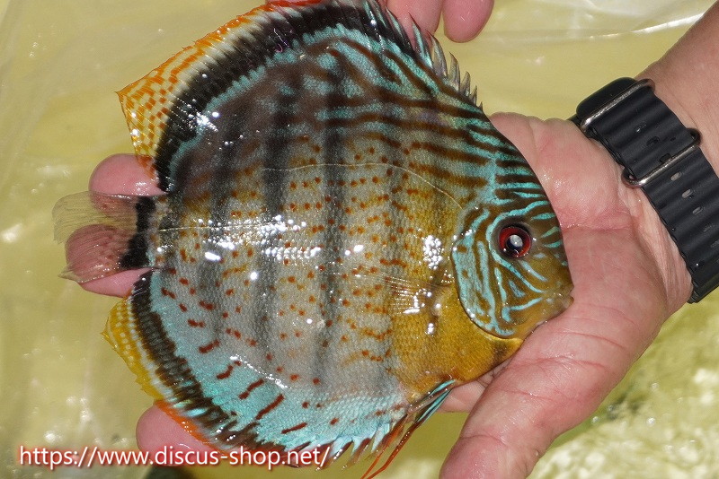 グリーンディスカスの中でも最もバリエーションが豊富でラージスポットタイプ、スポットラインタイプをはじめ、ロイヤルラインタイプなどの極上個体。またベースカラーの黄色、ホリゾンタルラインの青み、スポットの赤と最もカラフルな種となります。仕上がれば改良品種顔負けのど派手なパターンを持つ魅力的な産地の個体となります。