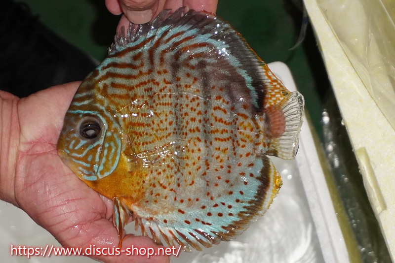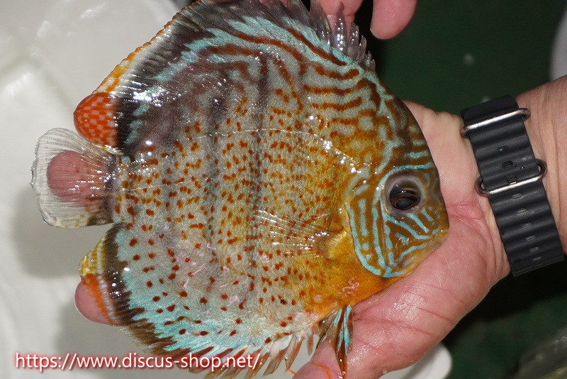 グリーンディスカスの中でも最もバリエーションが豊富でラージスポットタイプ、スポットラインタイプをはじめ、ロイヤルラインタイプなどの極上個体。またベースカラーの黄色、ホリゾンタルラインの青み、スポットの赤と最もカラフルな種となります。仕上がれば改良品種顔負けのど派手なパターンを持つ魅力的な産地の個体となります。