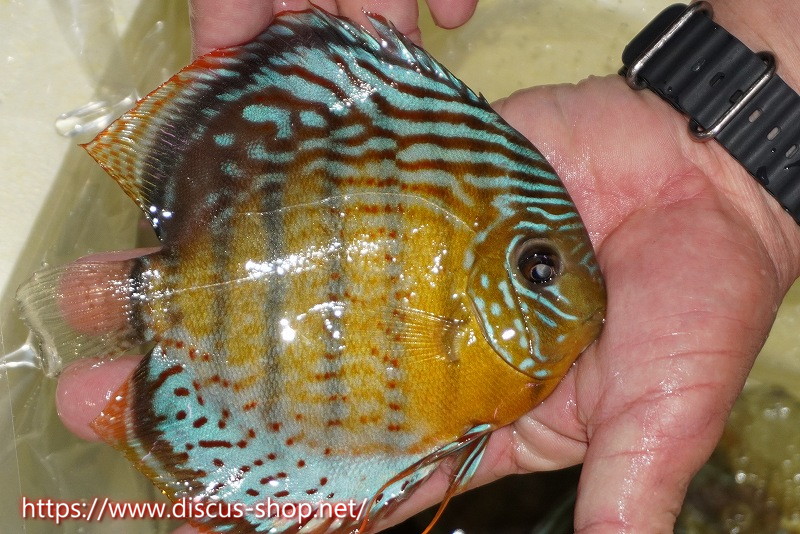 グリーンディスカスの中でも最もバリエーションが豊富でラージスポットタイプ、スポットラインタイプをはじめ、ロイヤルラインタイプなどの極上個体。またベースカラーの黄色、ホリゾンタルラインの青み、スポットの赤と最もカラフルな種となります。仕上がれば改良品種顔負けのど派手なパターンを持つ魅力的な産地の個体となります。