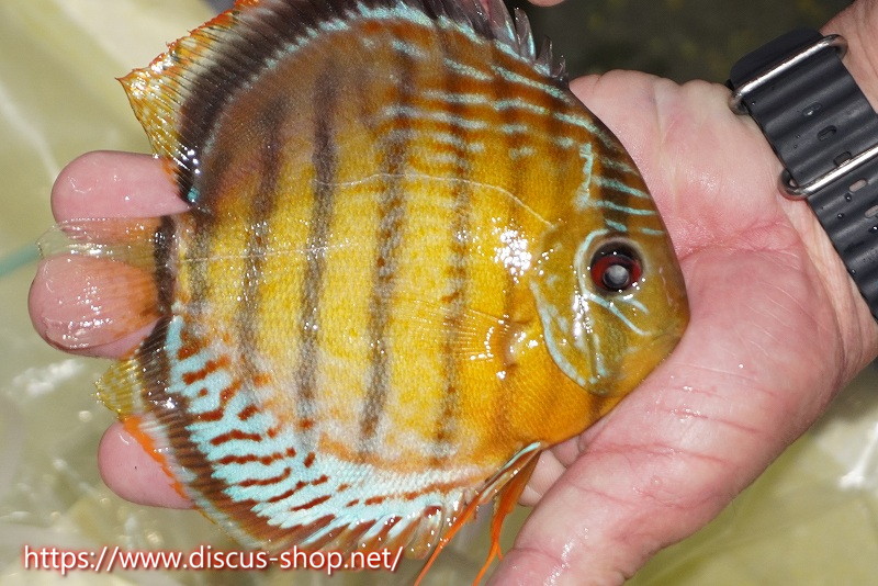 グリーンディスカスの中でも最もバリエーションが豊富でラージスポットタイプ、スポットラインタイプをはじめ、ロイヤルラインタイプなどの極上個体。またベースカラーの黄色、ホリゾンタルラインの青み、スポットの赤と最もカラフルな種となります。仕上がれば改良品種顔負けのど派手なパターンを持つ魅力的な産地の個体となります。