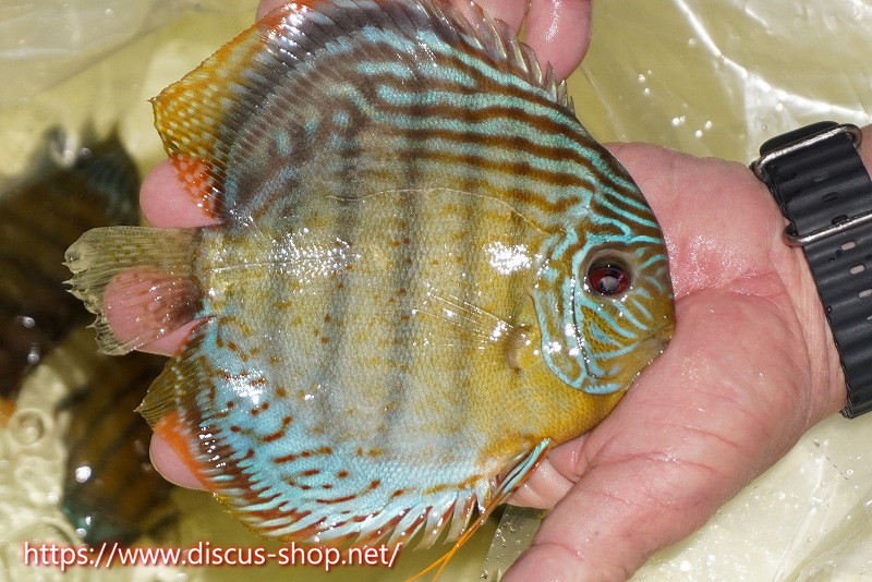 グリーンディスカスの中でも最もバリエーションが豊富でラージスポットタイプ、スポットラインタイプをはじめ、ロイヤルラインタイプなどの極上個体。またベースカラーの黄色、ホリゾンタルラインの青み、スポットの赤と最もカラフルな種となります。仕上がれば改良品種顔負けのど派手なパターンを持つ魅力的な産地の個体となります。