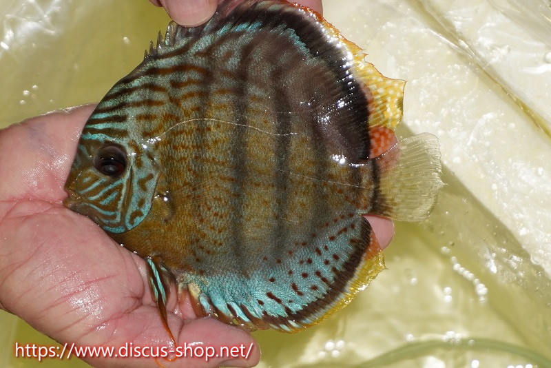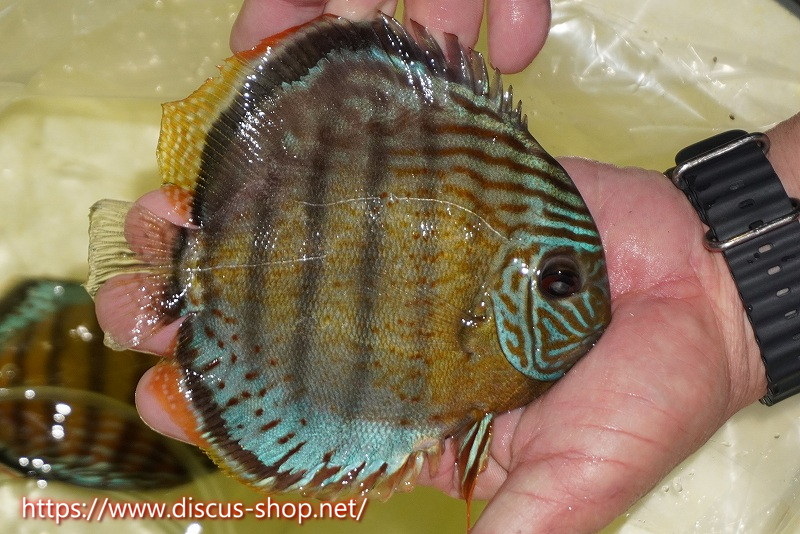 グリーンディスカスの中でも最もバリエーションが豊富でラージスポットタイプ、スポットラインタイプをはじめ、ロイヤルラインタイプなどの極上個体。またベースカラーの黄色、ホリゾンタルラインの青み、スポットの赤と最もカラフルな種となります。仕上がれば改良品種顔負けのど派手なパターンを持つ魅力的な産地の個体となります。