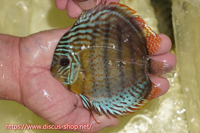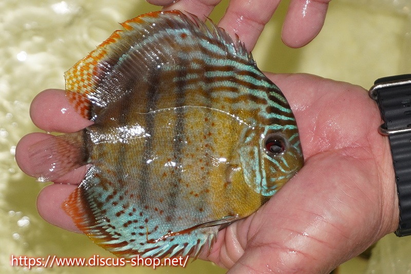 グリーンディスカスの中でも最もバリエーションが豊富でラージスポットタイプ、スポットラインタイプをはじめ、ロイヤルラインタイプなどの極上個体。またベースカラーの黄色、ホリゾンタルラインの青み、スポットの赤と最もカラフルな種となります。仕上がれば改良品種顔負けのど派手なパターンを持つ魅力的な産地の個体となります。