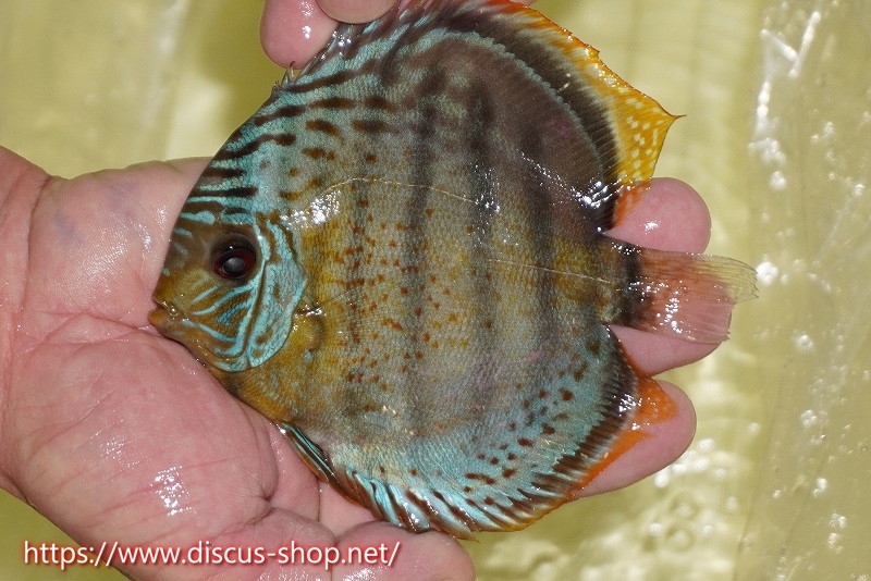 グリーンディスカスの中でも最もバリエーションが豊富でラージスポットタイプ、スポットラインタイプをはじめ、ロイヤルラインタイプなどの極上個体。またベースカラーの黄色、ホリゾンタルラインの青み、スポットの赤と最もカラフルな種となります。仕上がれば改良品種顔負けのど派手なパターンを持つ魅力的な産地の個体となります。