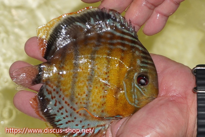 グリーンディスカスの中でも最もバリエーションが豊富でラージスポットタイプ、スポットラインタイプをはじめ、ロイヤルラインタイプなどの極上個体。またベースカラーの黄色、ホリゾンタルラインの青み、スポットの赤と最もカラフルな種となります。仕上がれば改良品種顔負けのど派手なパターンを持つ魅力的な産地の個体となります。