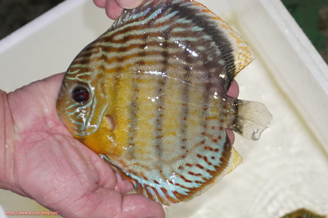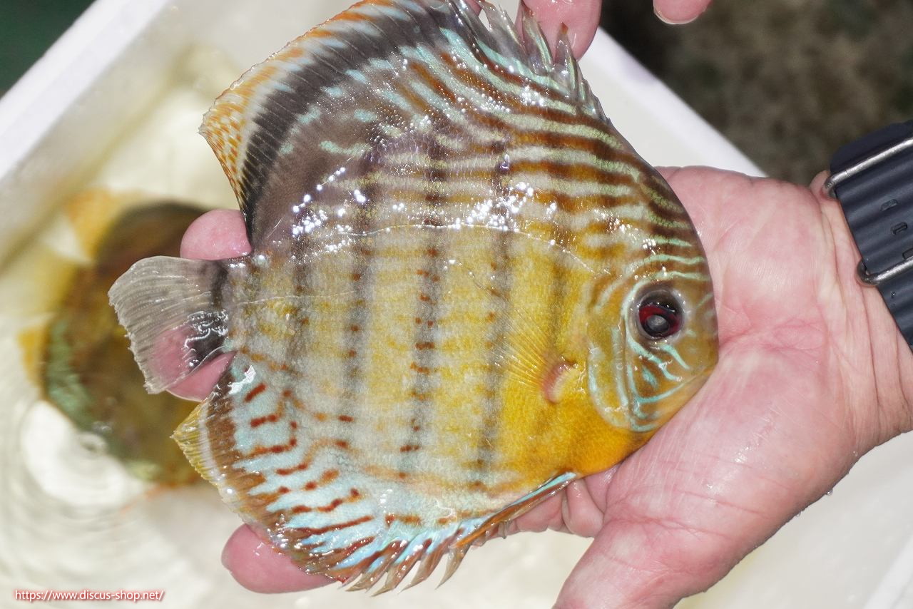 グリーンディスカスの中でも最もバリエーションが豊富でラージスポットタイプ、スポットラインタイプをはじめ、ロイヤルラインタイプなどの極上個体。またベースカラーの黄色、ホリゾンタルラインの青み、スポットの赤と最もカラフルな種となります。仕上がれば改良品種顔負けのど派手なパターンを持つ魅力的な産地の個体となります。