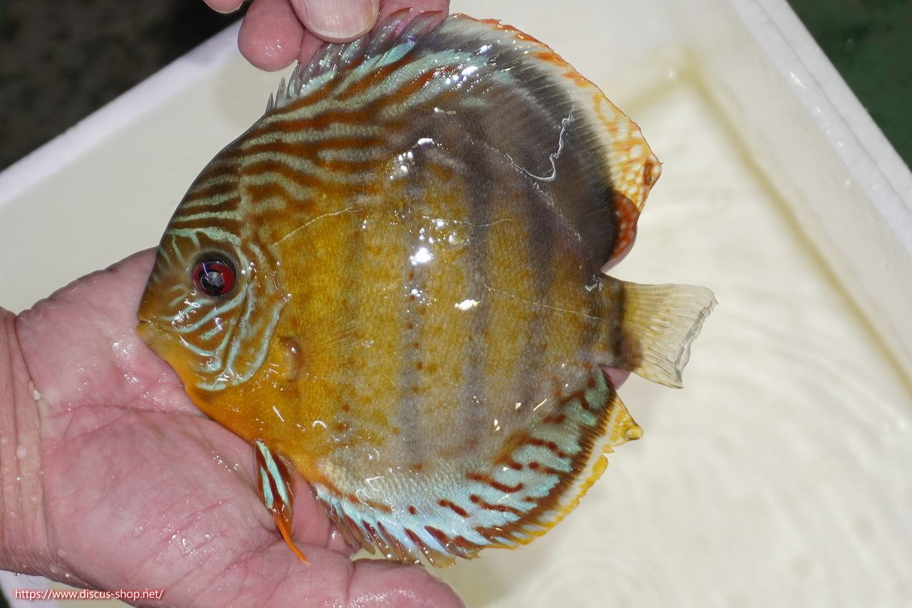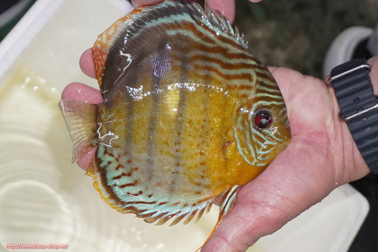 グリーンディスカスの中でも最もバリエーションが豊富でラージスポットタイプ、スポットラインタイプをはじめ、ロイヤルラインタイプなどの極上個体。またベースカラーの黄色、ホリゾンタルラインの青み、スポットの赤と最もカラフルな種となります。仕上がれば改良品種顔負けのど派手なパターンを持つ魅力的な産地の個体となります。