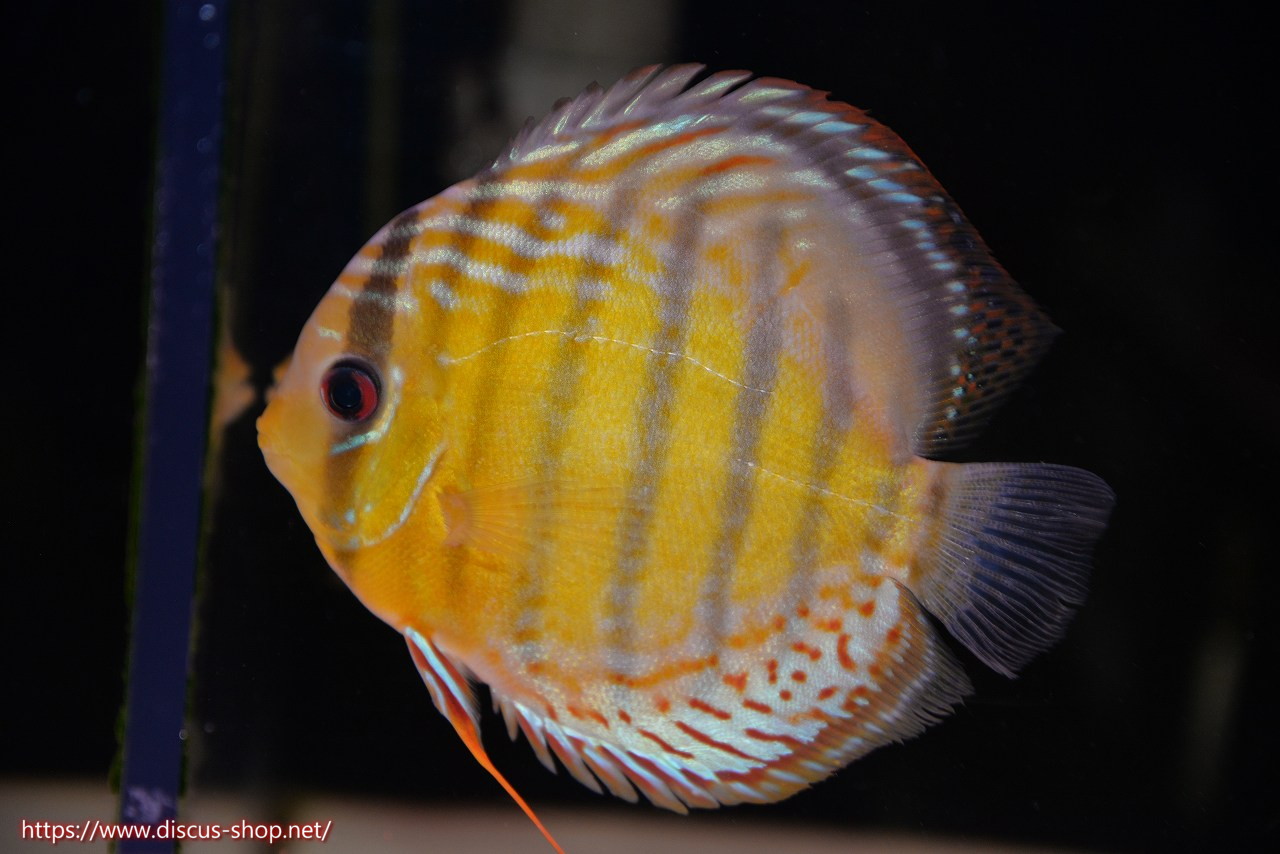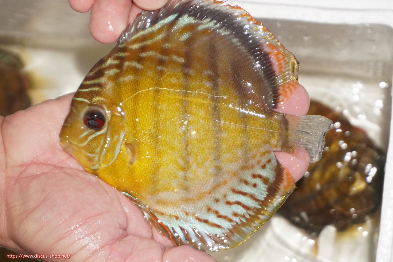 グリーンディスカスの中でも最もバリエーションが豊富でラージスポットタイプ、スポットラインタイプをはじめ、ロイヤルラインタイプなどの極上個体。またベースカラーの黄色、ホリゾンタルラインの青み、スポットの赤と最もカラフルな種となります。仕上がれば改良品種顔負けのど派手なパターンを持つ魅力的な産地の個体となります。