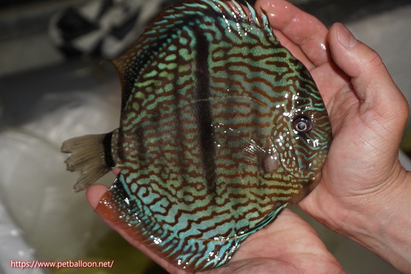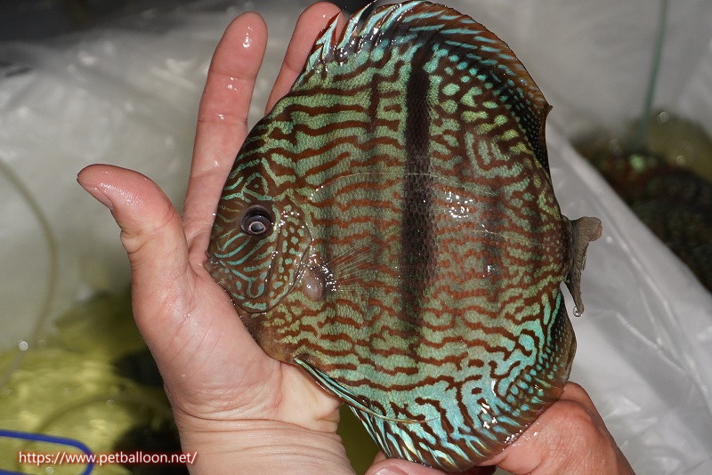 KLディスカスファームに1匹のみファームオーナーが大切にストックしていたプレミアム個体。ワイルドヤムンダブルームーンを交配しヘビーセンターバーを持ち、ブルームーンの青みとベースカラーのえんじ色を非常にうまく表現しているワイルドクロス個体です。ブルーのラインを進化させ、より上品にかつ細やかに入るラインパターンとこのファーム特有の素晴らしい体型を持った品種となります。
