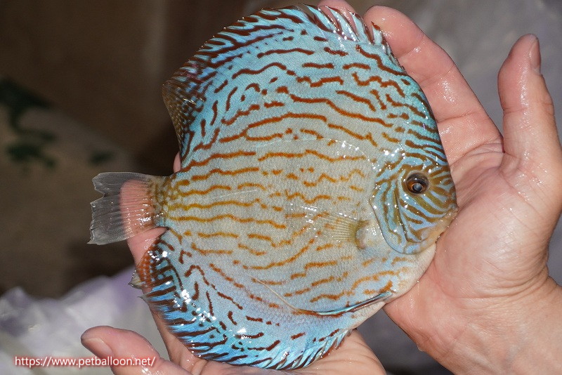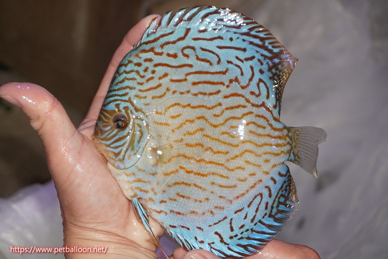 青系ディスカスの王道ブリリアントの中でもこれほど発色良くバランスが良い個体は早々おらずフォルム良し、発色良しと文句なしの個体と言えます。今後よりその青みは増しパターンも相まって変化してゆくので非常に楽しみある個体です。