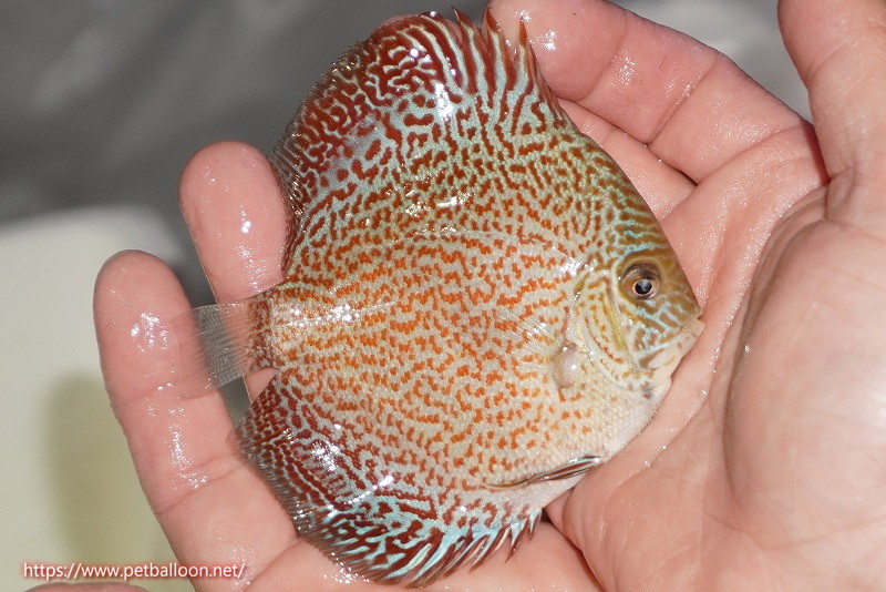 ボディーの青の発色と虫食い状のラインスポット、そのパターンはフェイス部分まで達する極上品種。フォルムも素晴らしく迫力ある個体です。スポット系ディスカスの最高峰個体と言えます。このサイズにしてこの完成度は唯一無二と言っても過言ではありません。
