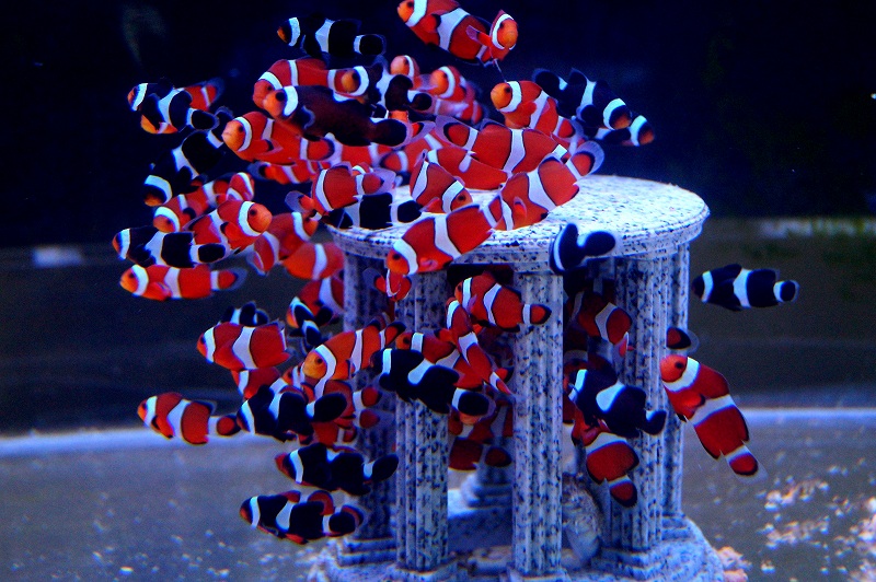 『ファインディング・ニモ』という映画に登場して以来、大人気のクマノミです。飼育は容易な上、性格もさほど強くないので他の魚種との混泳も殆ど可能ですが、攻撃的な魚とは一緒に飼育しないように注意が必要です。餌については人工飼料を良く食べますので、餌付けに困ることはありません。またイソギンチャクとの共生に関しては、ハタゴイソギンチャクやセンジュイソギンチャクなどを好んで共生します。複数飼育下では成長と共にペアが出来る場合も多く、繁殖を楽しむ事も可能です。
