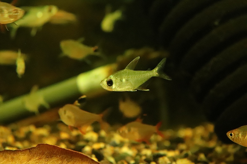フォルムはダイヤモンドテトラですが、鱗のギラギラはなく透明感のある体色をしており、目の引くきつい赤のアイラインが入っています。